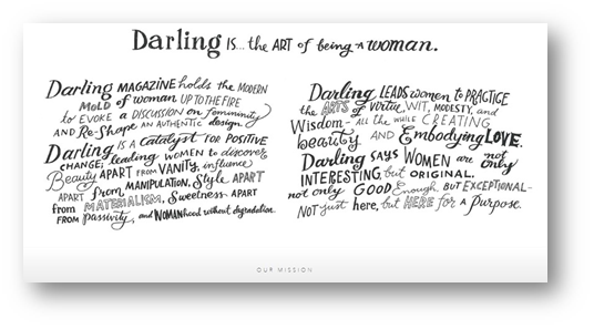 "Darling is… the art of being a woman. Darling holds the modern mold of women up to the fire to evoke a discussion on femininity and re-shape an authentic design. Darling is a catalyst for positive change; leading women to discover beauty apart from vanity, influence apart from manipulation, style apart from materialism, sweetness apart from passivity, and womanhood without degradation. Darling leads women to practice the arts of virtue, wit, modesty, and wisdom – all while creating beauty and embodying love. Darling says women are not only interesting, but original, not only good enough, but exceptional – not just here, but here for a purpose."