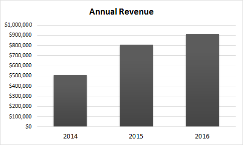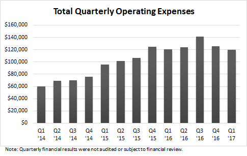 In 2016, operating expenses totaled $511,825, up 19% from 2015. Compensation (payroll) and employee benefits were roughly 63% of total operating expenses in 2016, followed by general & administrative expenses (~30%) and sales & marketing expenses (~7%).