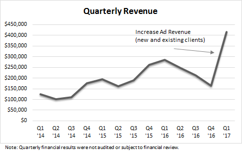 Darling usually experiences the highest revenue in Q4 with fall and holiday sales. However, 2016 did not follow the normal pattern. One of the main contributors to the downturn in Q4 2016 was the U.S. Presidential election. The adverse impact of this past U.S. election was not isolated to Darling’s sales and was noted by consumersi and many businessesii across the retail market. In Q1 2017, the company generated nearly $417,000 ─ its best quarter to date ─ up roughly 46% from Q1 2016. The increase in sales was due to increased advertising revenue from new and existing clients. Specifically, the strong Q1 results represent the first invoices tied to a new campaign with existing client Aerie as well as an activation with a new client, UGG Australia.